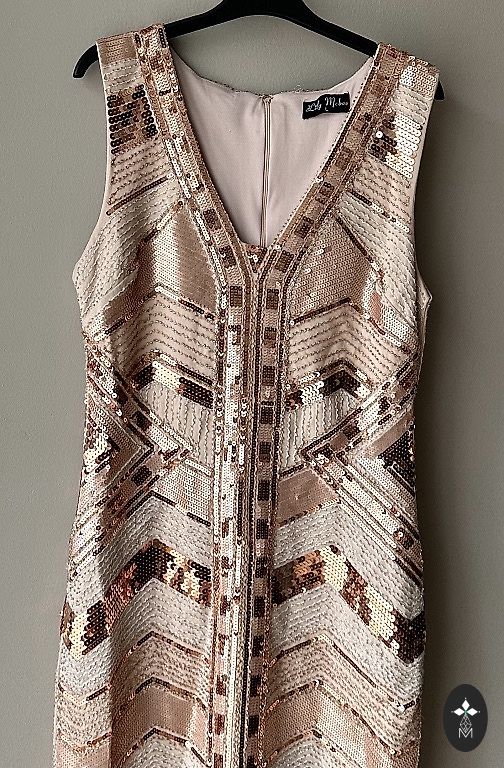 🔸 Mirdzošs zelta fliteru raksts, kas izceļ figūru un rada greznu efektu jebkurā apgaismojumā