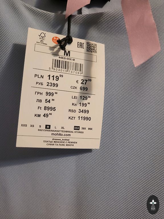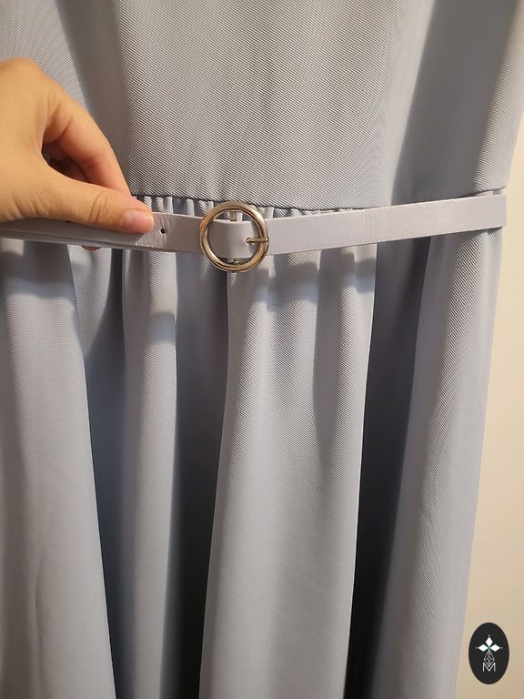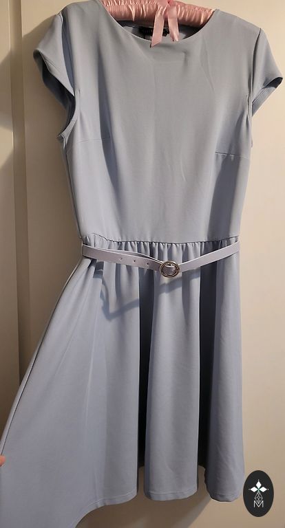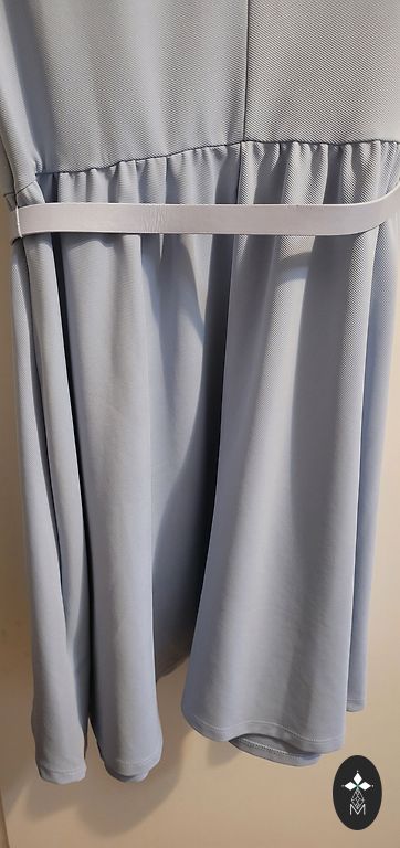 Trumpa suknelė yra tinkama tiek kasdienai, tiek iškilmingesniems renginiams. Tinka M dydžiui (ant etiketės nurodyta 42, kuris iš tikrųjų atitinka M). Ilgis: 85 cm; Spalva: Tamsiai mėlyna su smulkiu, šviesiu siūlų raštu. Apvalus kaklo iškirpimas. Gale visame ilgyje yra sagų eilė (dekoratyvinės sagos). Priekyje dvi kišenės su metaliniais elementais, suteikiančiais modernų akcentą. Smulkus dekoratyvinis prisegamo tipo elementas prie kaklo iškirpimo priekyje. Suknelė yra labai patogi.