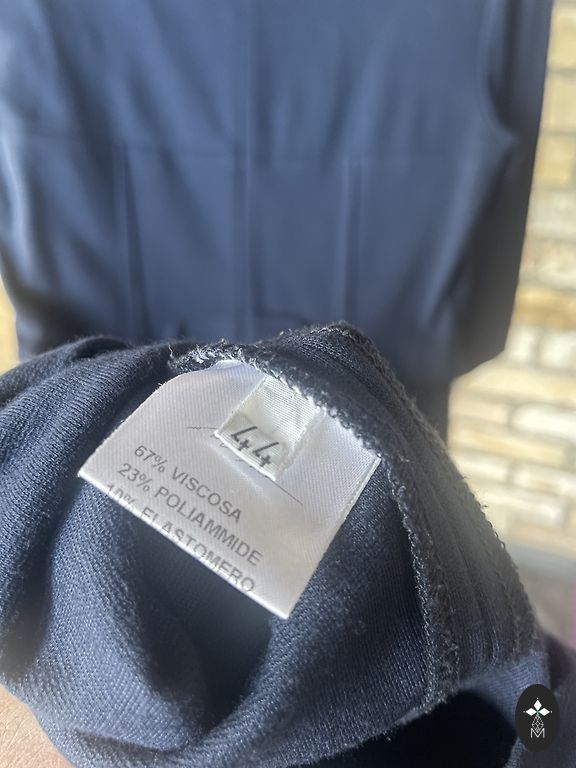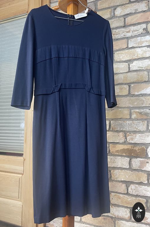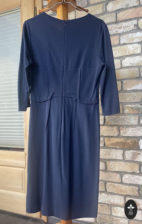 Kleita + Žakete, norādīts 40 izmērs, bet īstenībā ir uz M. Vidukļa apkārtmērs- 76cm, krūšu apkārtmērs-90cm, garums- 105cm, piedurknes garums- 58cm, žaketes garums- 46cm.