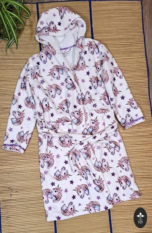 Suurepärane hommikumantel pärast vannis või meres käimist. Täpset suurust ei saa öelda, kuna silt on ära lõigatud. Laius kaenla alt 38 cm. Pikkus nööpidest - 66 cm. Mugavad trukid ja kapuuts.