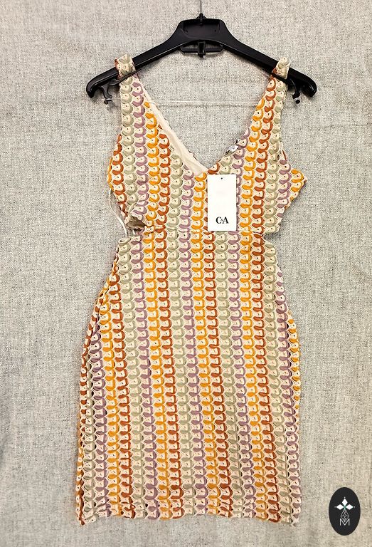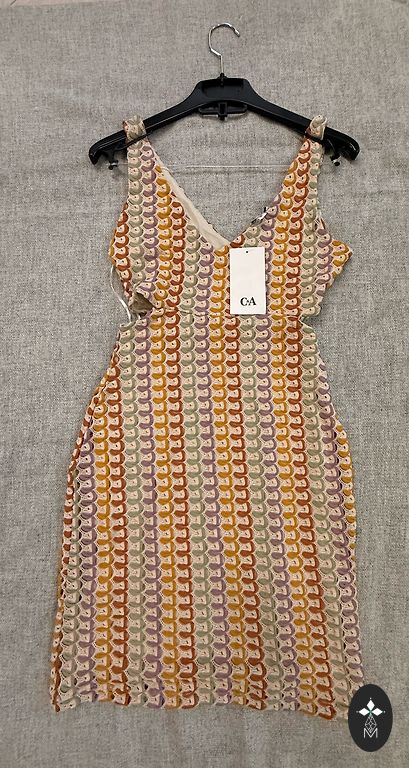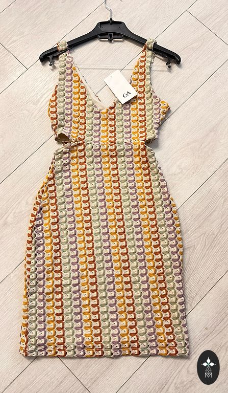 Viskoos, puuvill, polüester, pehme puudutusega. Taskutega. Rindkere 130, puusad 130, pikkus 102 cm. Itaalia