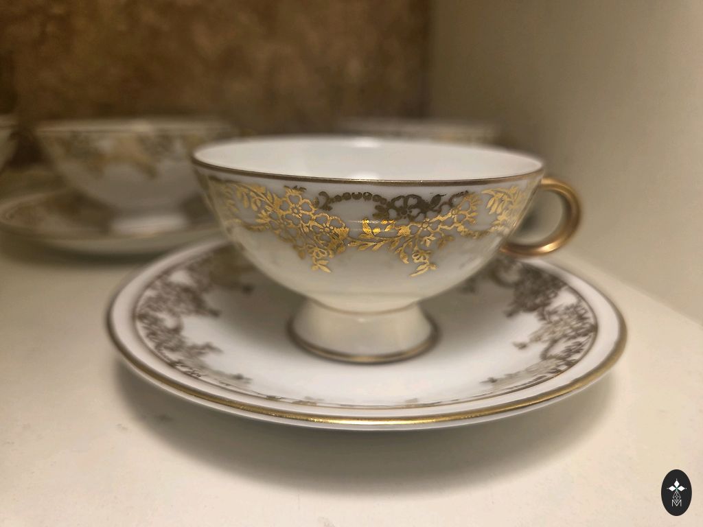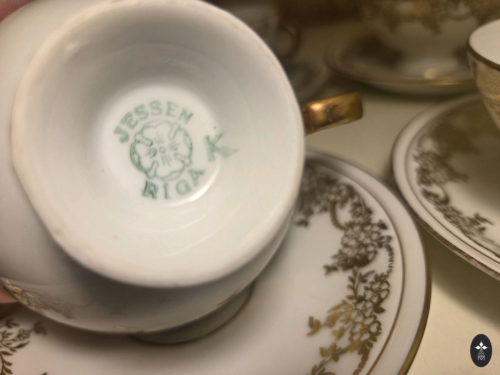 Pilnas servisas, visi daiktai. Balta su viena plačia ir viena siaura aukso juostele. Ateina iš vienos namų ūkio, bet yra žali ir keli mėlyni antspaudai. Pridedama dar viena puodelis. Būklė yra labai gera. Yra keletas taškų, vienam lėkštelės dugnui yra visiškai nepastebimas įtrūkimas, yra nedideli glazūros trūkumai. Arbatinuko snapelis turi įskilimą, bet nėra kritinis. Kitaip blizga ir švyti. Savo amžiui net labai gera būklė.