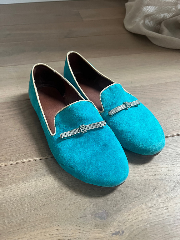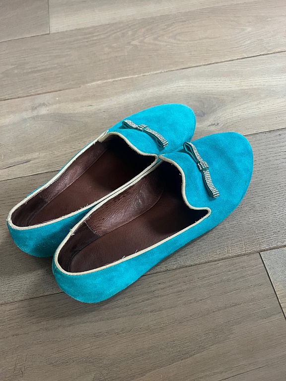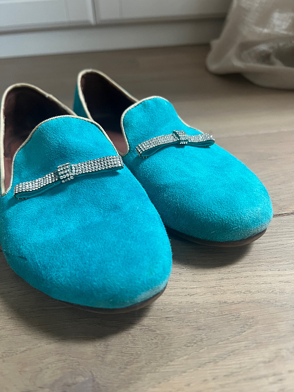 Pagaminti iš natūralios odos, patogūs, neslystantys, pieno rožinės spalvos, su mažomis skylutėmis viršutinėje dalyje, kad oras galėtų praeiti ir pėda galėtų gerai kvėpuoti.