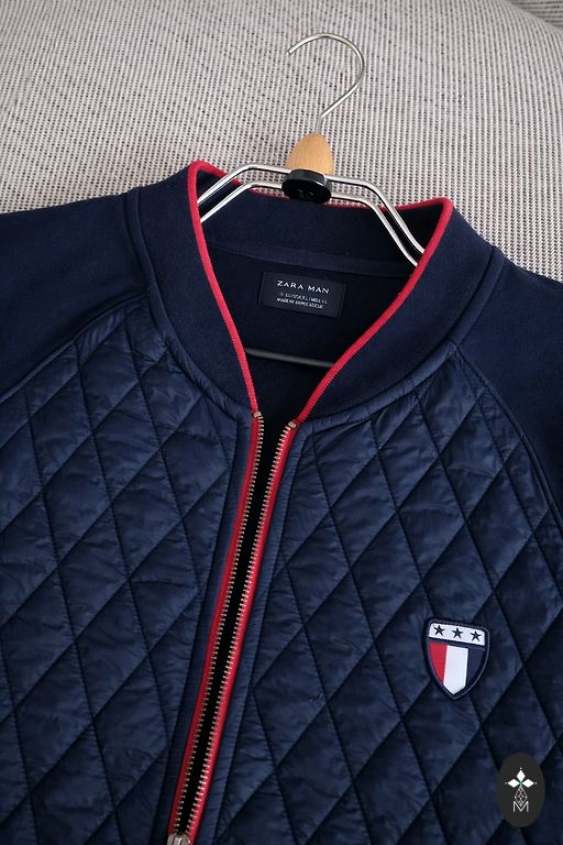 Dark blue quilted and slightly stretchy men's jacket. Front closure with zipper and 2 pockets. Lining. Collar and hem as well as sleeves with knitted cuffs. Sleeve length 70cm. Length from shoulder 67cm. Chest 124cm. Waist 102cm.