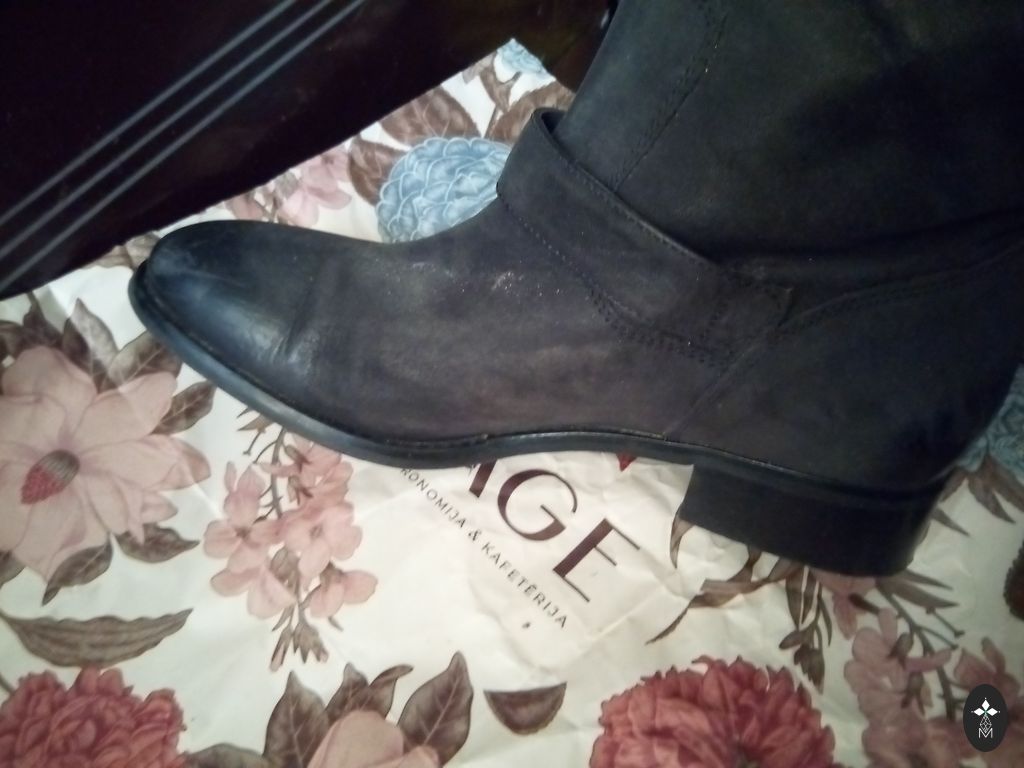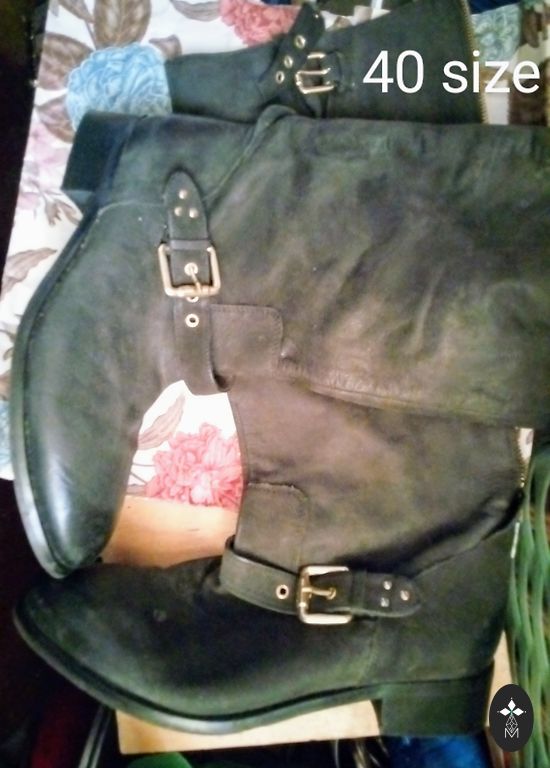 Saapad, nahast, sisemine pikkus 26 cm. Kõrgus 36 cm ilma kontsata, kontsa kõrgus 3 cm. Kerged ja mugavad, ilma sooja voodrita. Ülemise osa laius 40 cm.