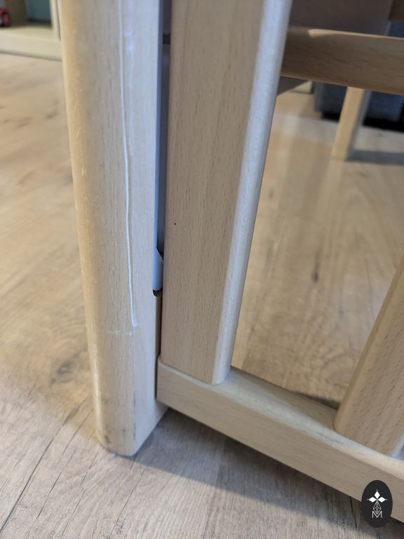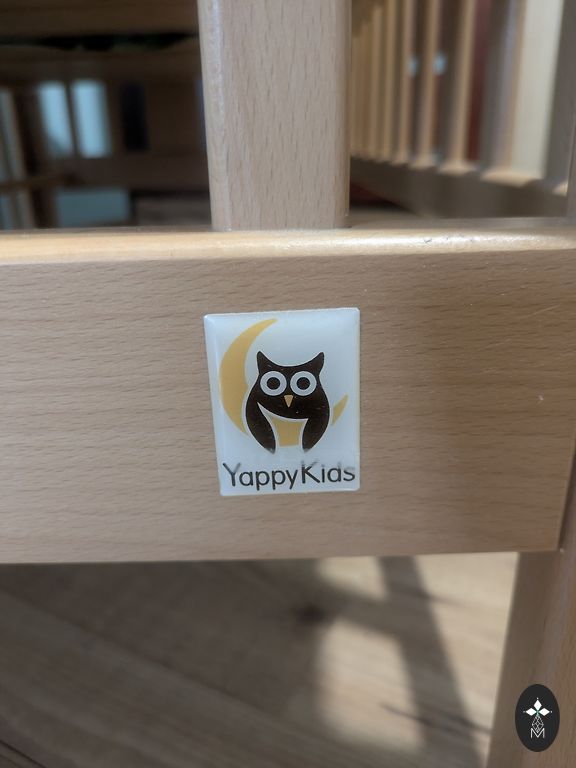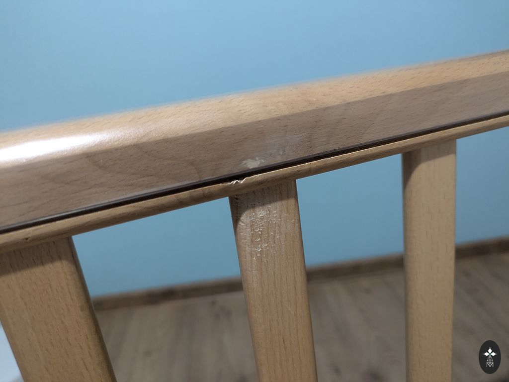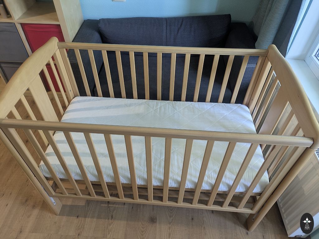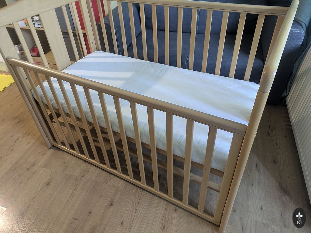 High bed, natural wood, solid, stable construction, but quite light. Sleeping area 70x160 cm, height from the ground approx. 92 cm. IKEA storage units fit well underneath - however, they are not included in the set. Furniture cardboard is stapled to the edge of the bed between the trees.