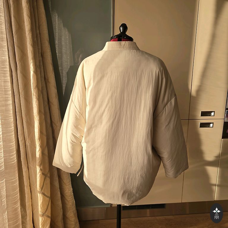 Между подмышками 68, длина без воротника 72, рукав 60, ширина плеч 46 см.