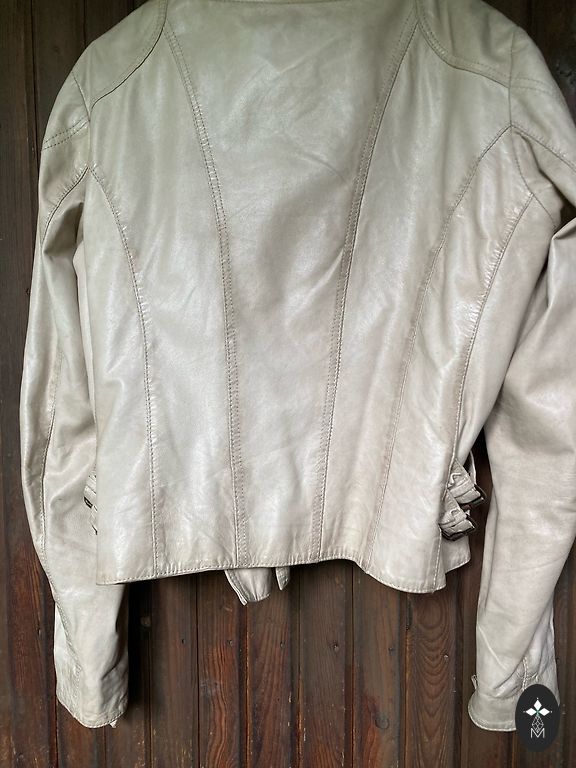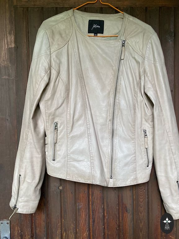 Lühike kunstnahast jakk. Vooderdatud. 3 funktsionaalset taskut. Metallist tõmblukud. Vöö. Jäik paks nahk.