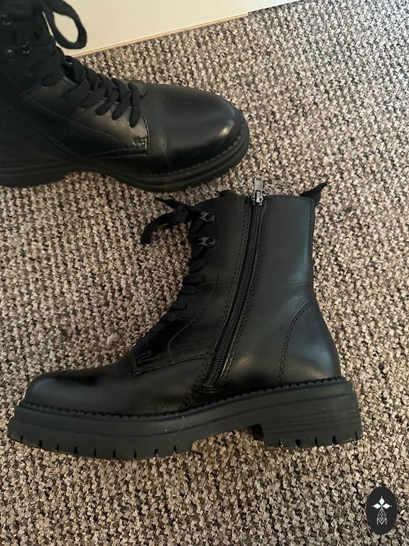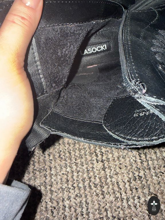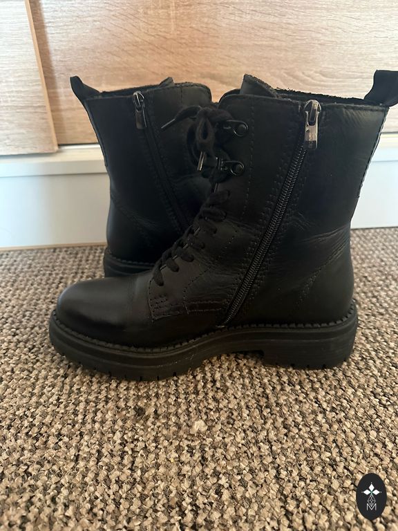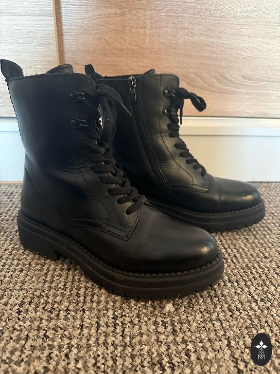Ziemas ādas zābaciņi iekšā ar dabīgo vilnu. Papēža augstums 6 cm. Nēsāti vienu sezonu.