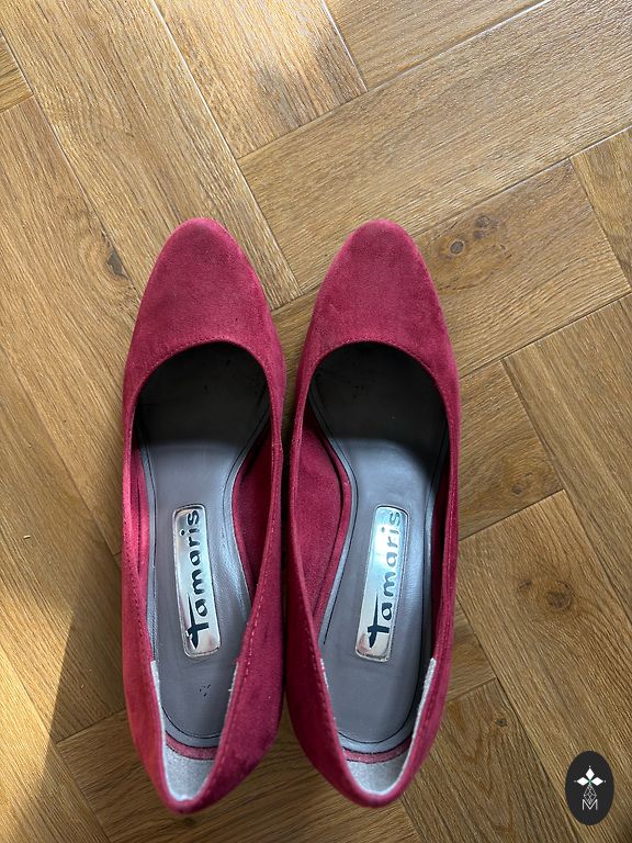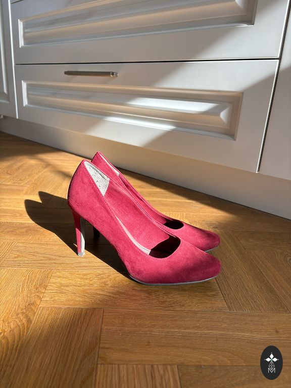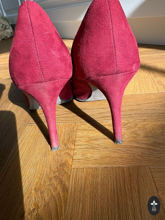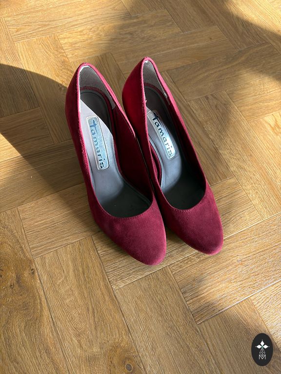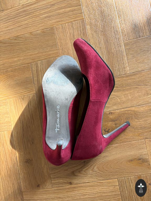 Excellent condition. Worn a few times. Stable heel 8cm. (Platform 2cm.) Rubber sole. For a medium, not narrow foot!