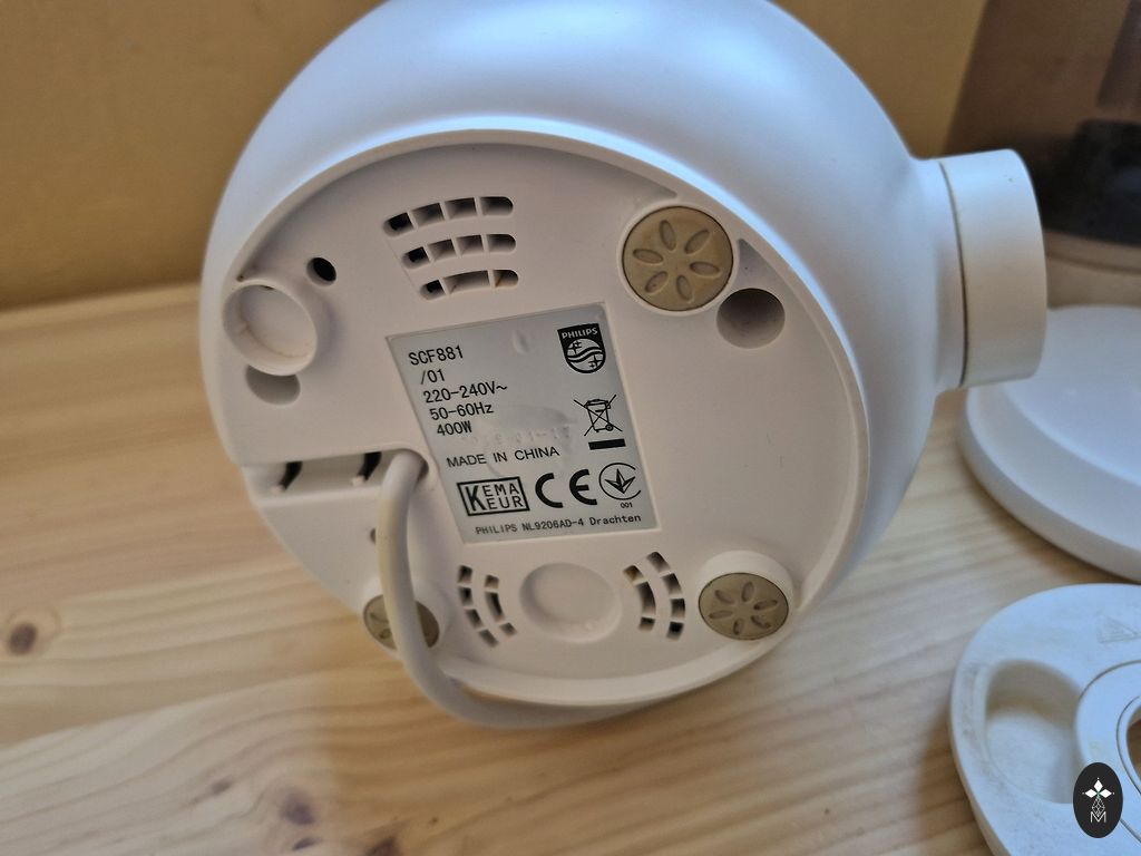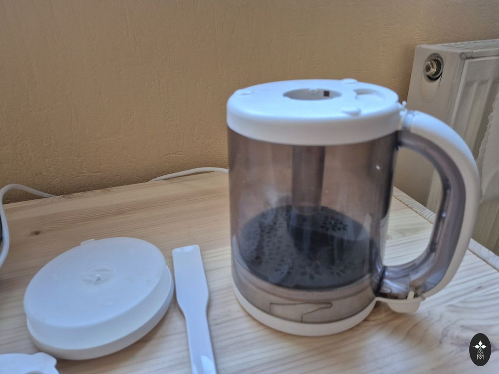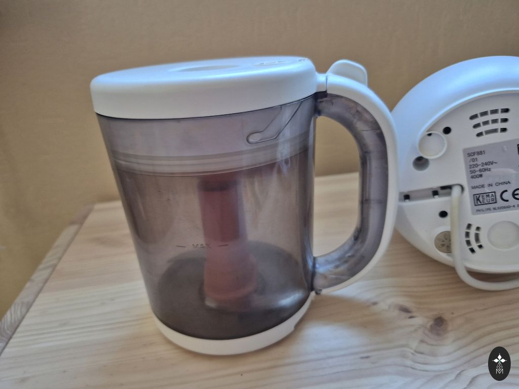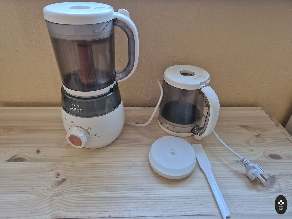 Geras pagalbininkas pirmam vaikų maitinimui. Philips Avent 4 in 1 garina, maišo, atšildo ir pašildo, ant puodelio yra mažų įbrėžimų nuo ašmenų, vienoje vietoje šiek tiek įplyšęs, plastmasė nuo maisto šiek tiek pakeitė spalvą, naudojimo metu buvo nukalkintas vandens rezervuaras, deja, buvo prarasta mentelė, padedanti išimti pašildytą indelį, bet pats indelis, kur šildo ar atšildo, yra, originalios dėžutės taip pat nėra.