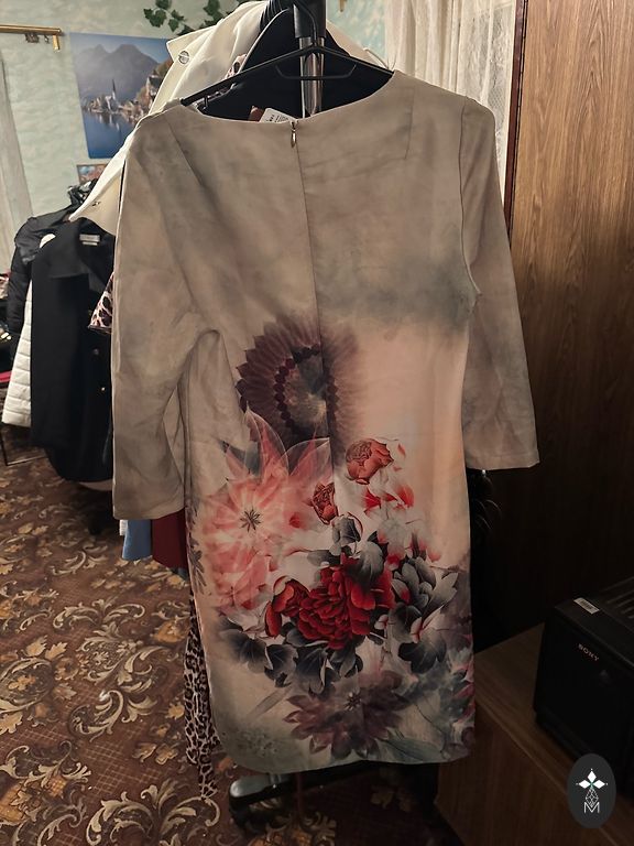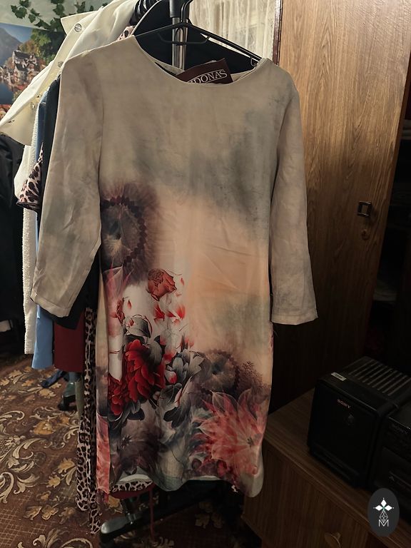 Kleita jostas vietā gumija,kabatiņas gan sānos,gan priekšā. Podziņas priekšā,lasīt pogājamas,krūšu platums 56×2cm. Vidukļa platums 37×2cm,izstieptā veidā 50×2cm. Piedurkņu garums no pleca 45cm, plecu garums 13cm. Mandžetes platums 14.5×2cm.Rudens,ziemas,agra pavasara kleita.