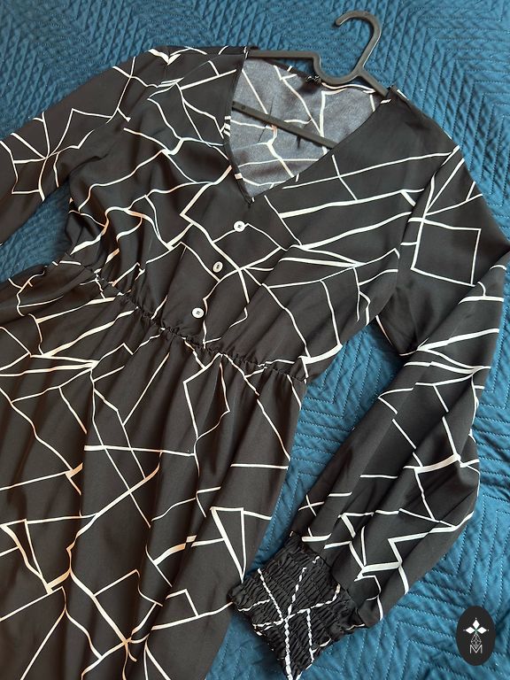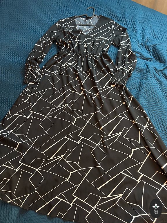 Beautiful black dress with white polka dots. Very soft fabric. Bust 150 cm, stretches a lot and is very loose. Hips 220+, very full bottom. Length 108 cm. Can be tied with a belt if necessary and looks super beautiful.