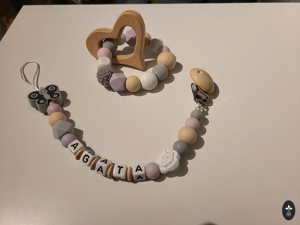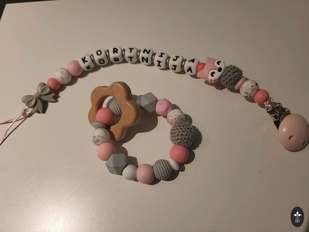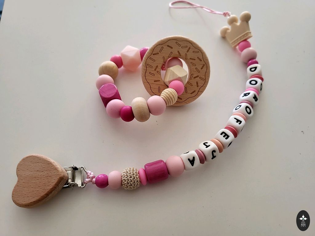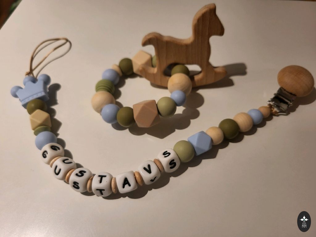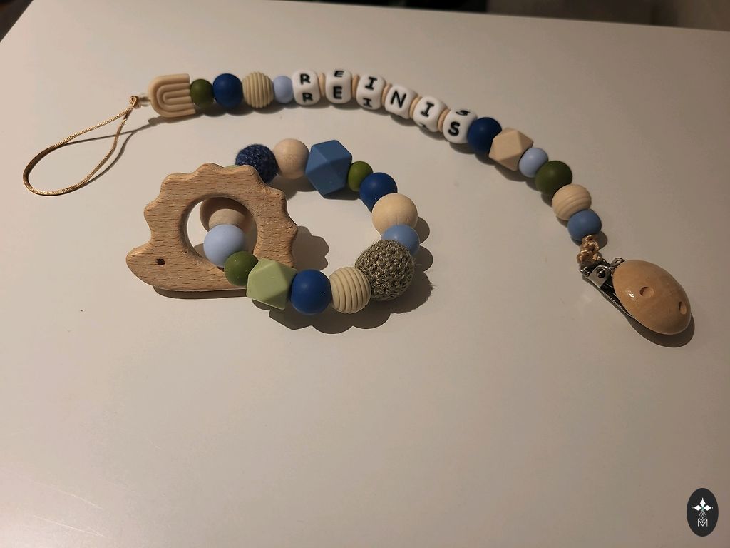 Komplekt sisaldab silikoonist ja puidust hammastumisrõngast, sisseehitatud puidust vormi ja isikupärastatud lutipidikut! Saadaval mitmesugustes värvides.