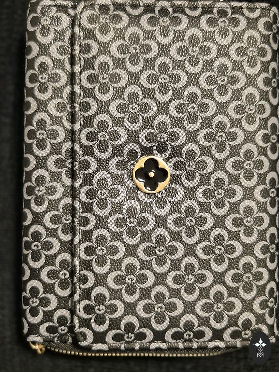 Melns atlasa audums dekorēts ar pērlītēm, akmentiņiem. Aizveras ar spiedpogu. Ir pleca ķedite. Somas platums 26cm. Augstums 17cm.