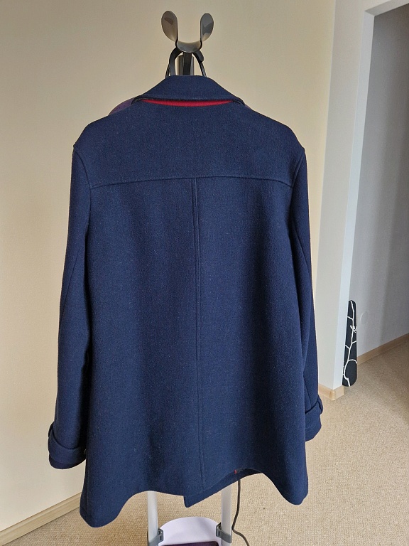 bagātīgā apkakle ap izgriezumu, nebūs jau kā jaka pilnīgi ciet), garuma 100cm, roka no kakla līdz piedurknei ap 70cm, kabatas, jostiņa, pogas var uz vienu vai otru pusi valkāt. Jautā!
