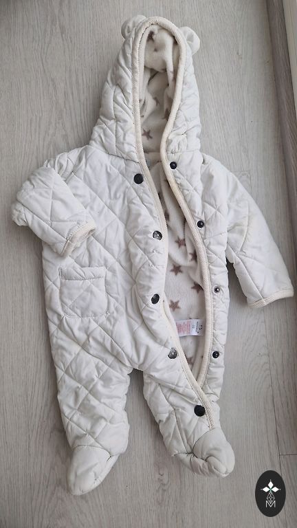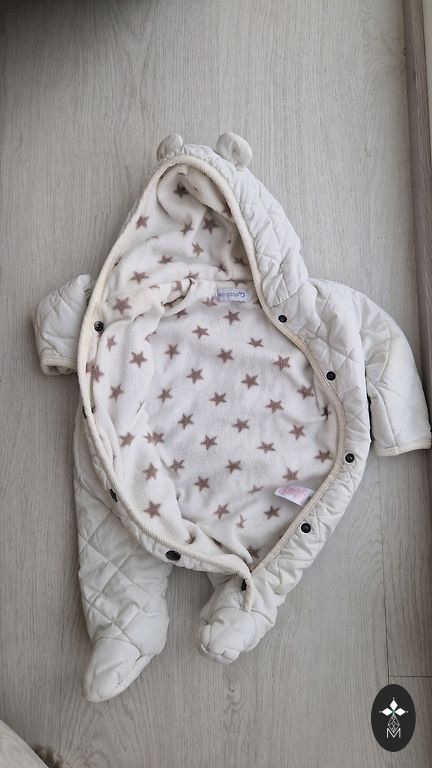 Soe kombinesoon saapadega ja kinnitatavate varrukate ja sääreosadega, sobib kõige paremini suurustele 68–74. Kasutatud, kuid heas seisukorras, midagi pole rebenenud, varrukate/sääreosade otstes veidi kulunud.