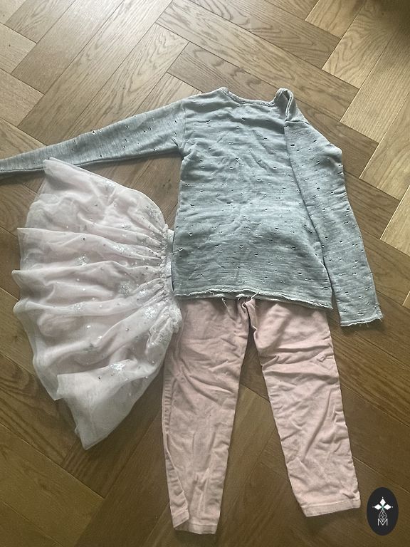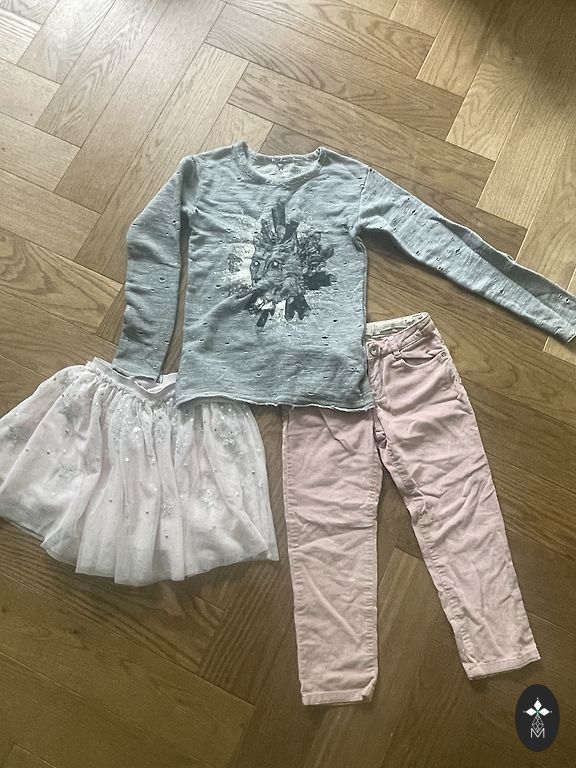 Mažajai princesei skirtas pirmasis „EcoEmi“ komplektas 56 dydžio su kimono stiliaus bodžiu ir atlenkamomis rankovėmis, kelnėmis su kojinėmis ir rausvu persikų spalvos raukinuku.