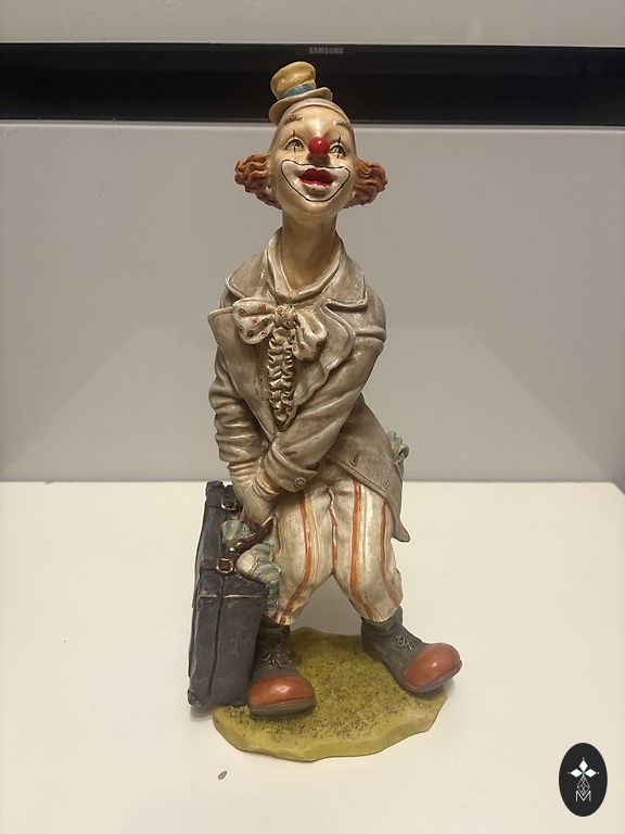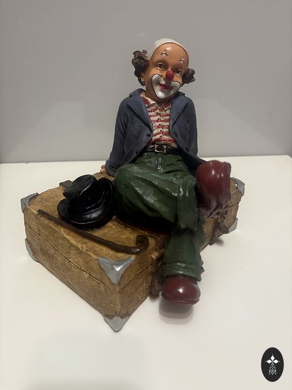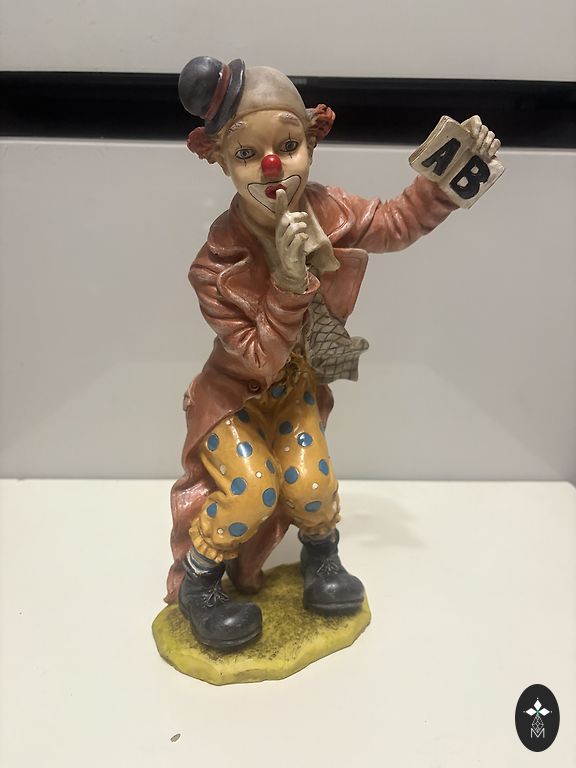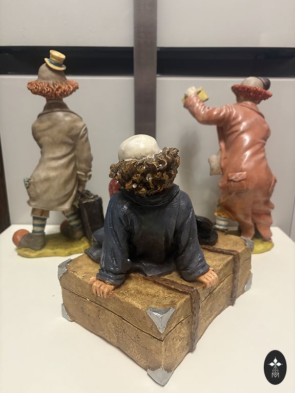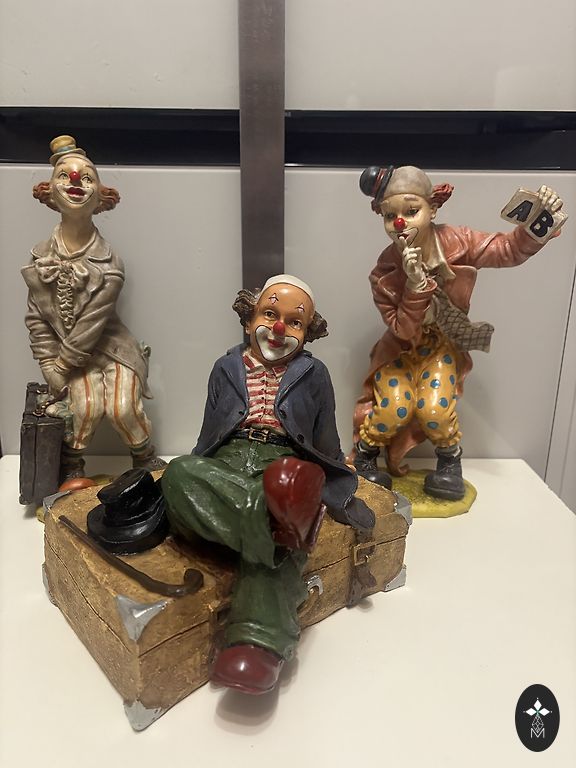 3 kvaliteetse klounifiguuri komplekt. Materjal – polüresiin (kunstkivi/vaik). Iga figuur on hoolikalt töödeldud ja käsitsi kaunilt maalitud. Kõrgus ~26-29cm. Seisukord suurepärane, ilma pragudeta ja kahjustusteta.