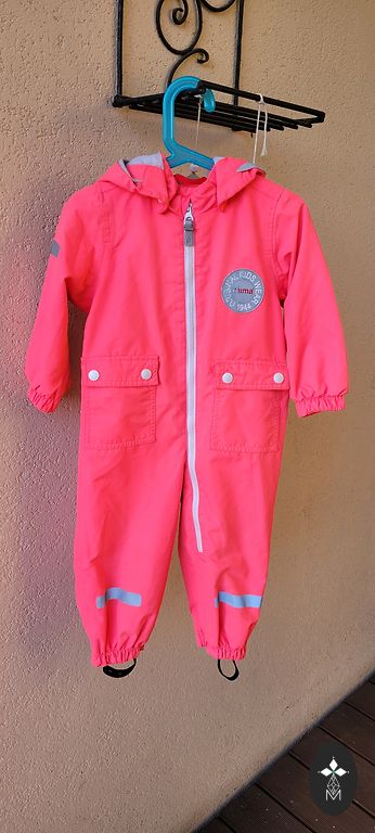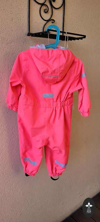 Tuule- ja veekindel kaheosaline kombinesoon. On märgitud, et see on mõeldud temperatuuridele vahemikus +5 kuni +15 kraadi, kuid me kasutasime seda ka madalamatel temperatuuridel. Põlved on veidi kulunud.