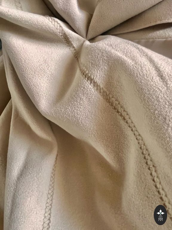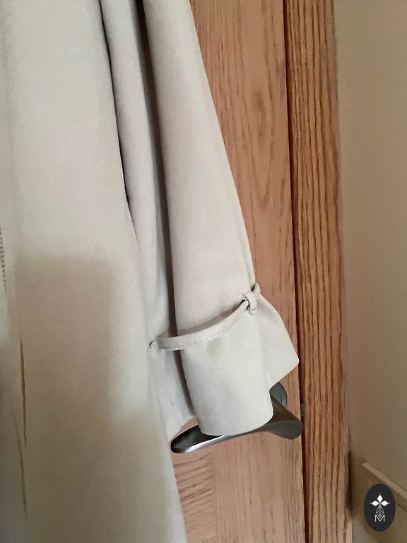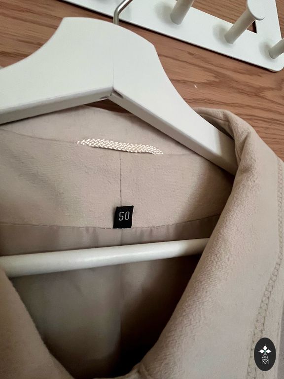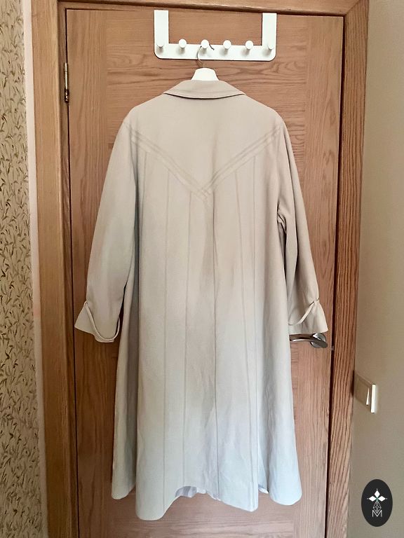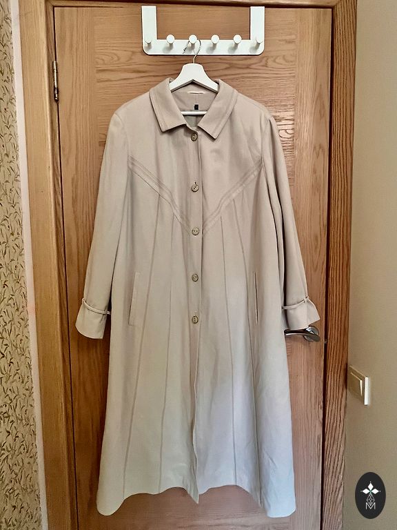Mētelis ir ar vienu pogu, brīvi krītoša silueta. Izmērs 46-48.krutis līdz 120 cm, garums 90 cm, rokas 50 cm. ērts, viegls.