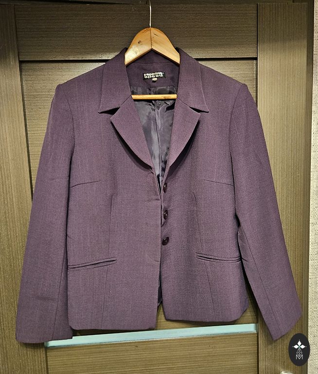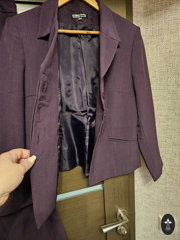 Dark purple suit (not available in the selection). I indicated good condition only because there is 1 button missing on the right sleeve. Everything else is in very good condition. Size 38.