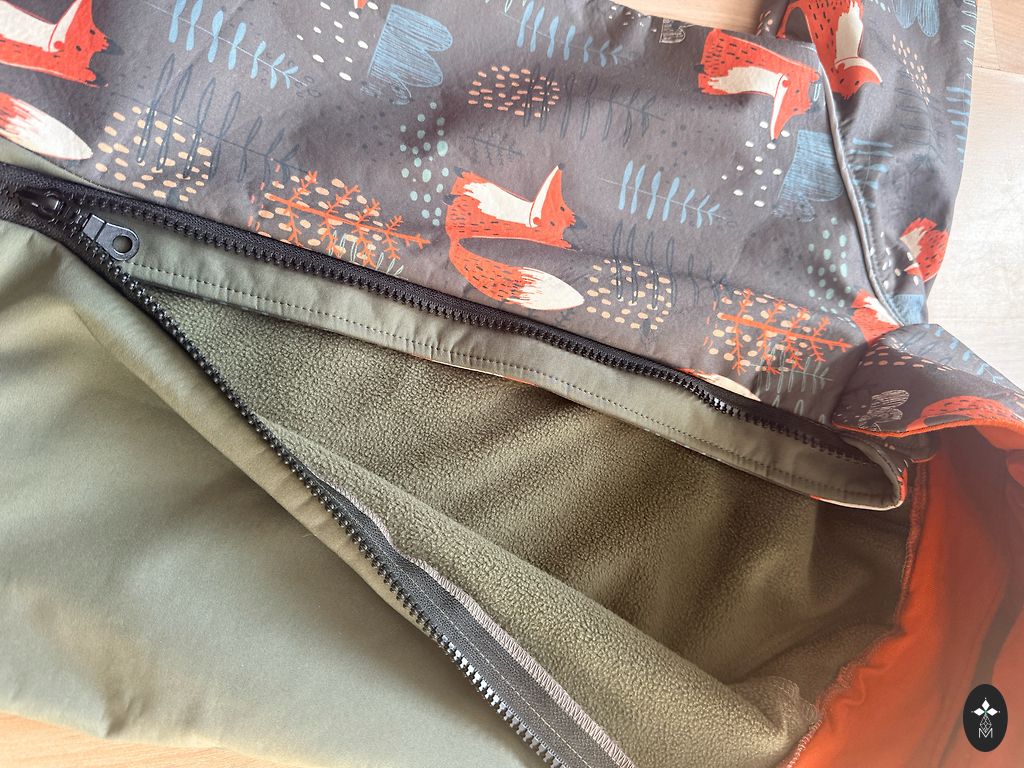 The Mikk-Line jumpsuit features a detachable hood that fastens with snap buttons around the neck collar. The hood has elastic inserts and a guard at the top of the face opening. The sleeves and legs have elastic edges, while the pant legs come with removable, adjustable rubber straps for shoe placement. There is a wide elastic band at the back, and the interior of the snow suit has practical, black elastic straps.