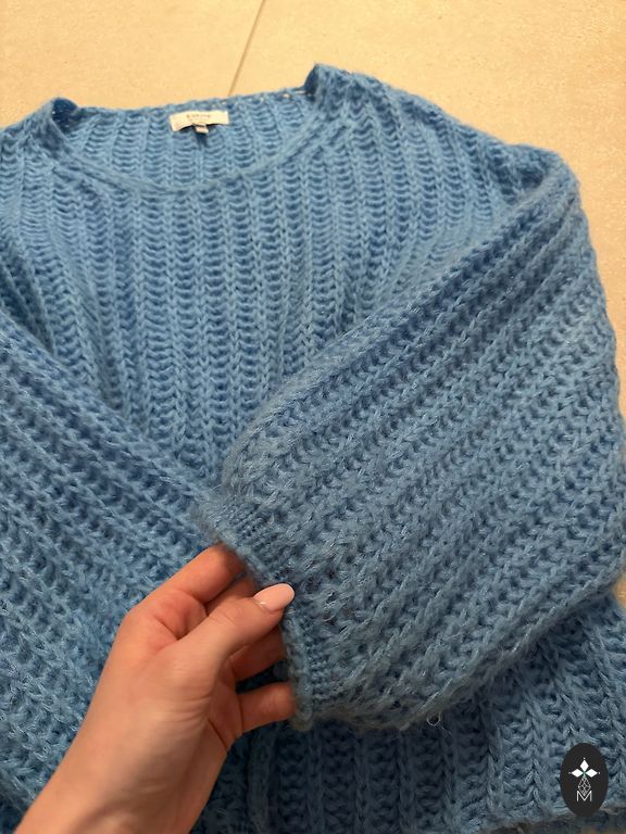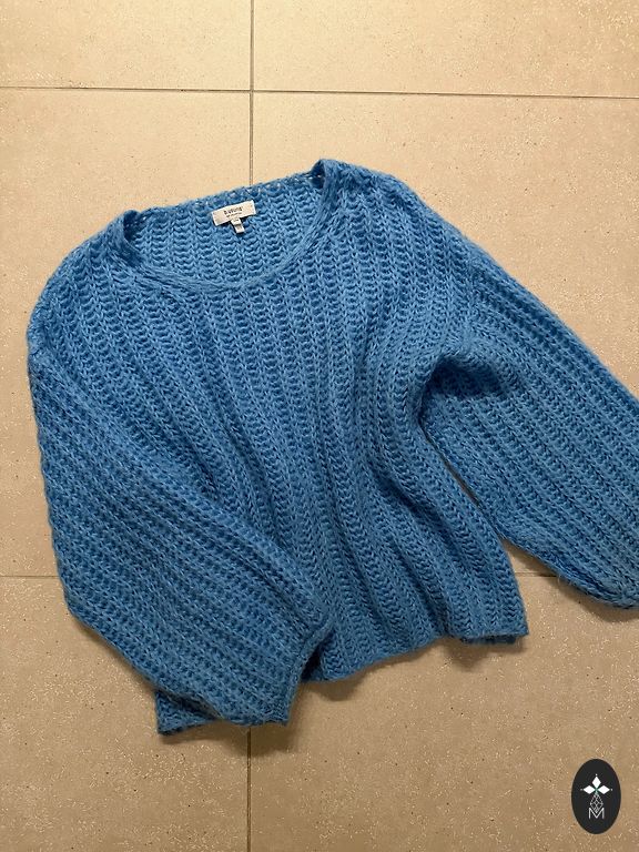 Užvilktas tris kartus, išplautas rankomis, naudojant specialias priemones vilnai. Puikios kokybės ir būklės. Nekandantis, labai minkštas ir ypač šiltas. Labai gražus, sodrus mėlynos spalvos atspalvis.