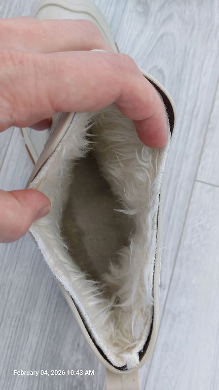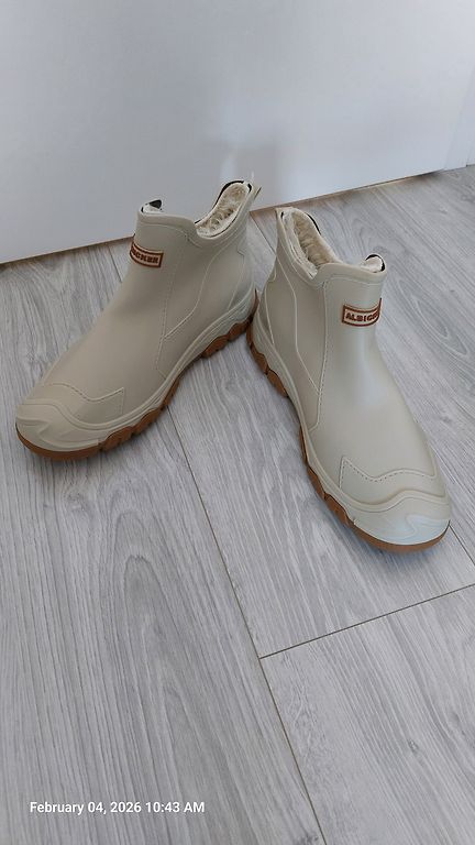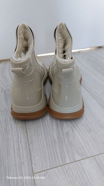 Naujos gumos batai su audinio blauzdomis, vidinė padas 27 cm, ilgis 34 cm. Nenudėvėti, bet yra nedidelis defektas dėl laikymo sąlygų – vieno bato vidinė guminė dalis pabalo.