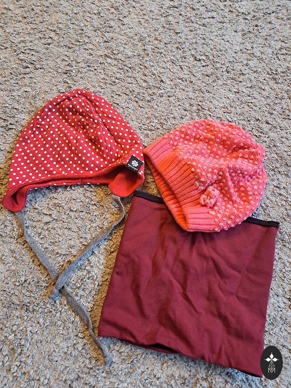 Rinkinys su kepurėmis, šalikais ir pirštinėmis, viskas labai geros būklės. Kepures dėvėjome apie 1,5-2 metų amžiaus.
