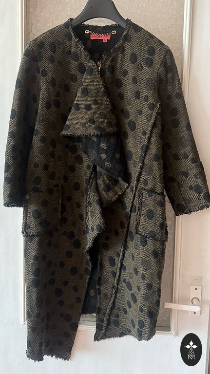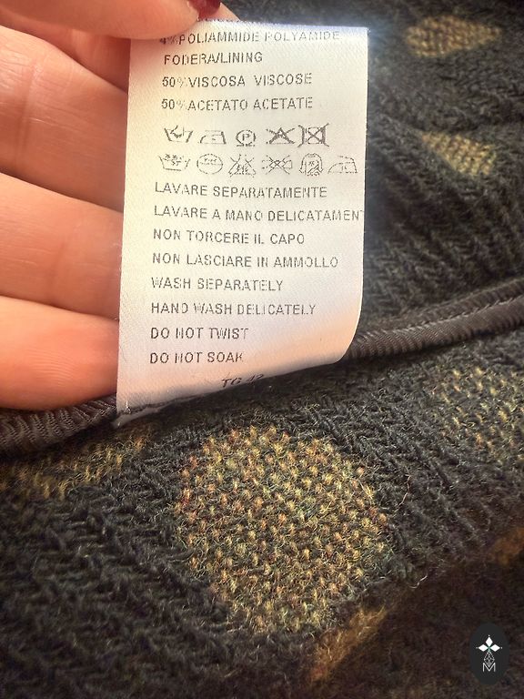 Kelnės, tankus elastingas medvilninis audinys, itališkas dydis 40, europinis dydis 34. Ilgis: 93 cm. Sudėtis: 48% medvilnės, 45% poliesterio, 7% elastano. Audinys nesitampys kelio srityje. Kelnės bet kokiai progai.