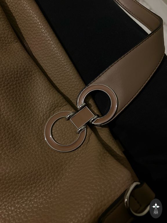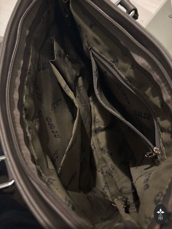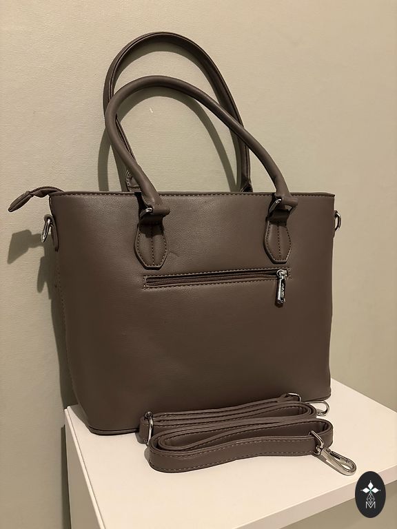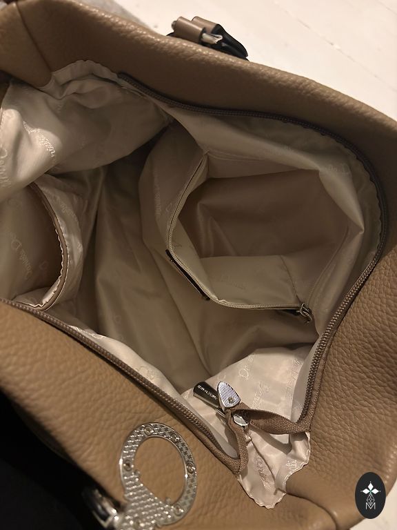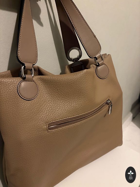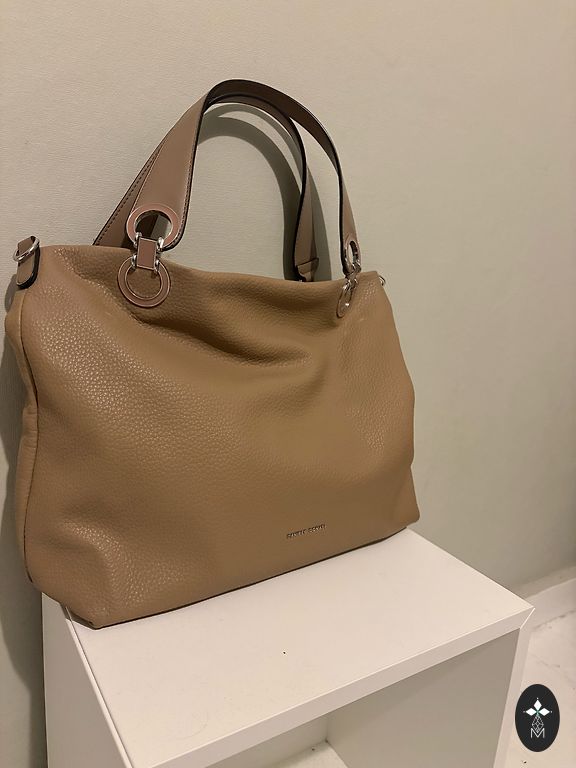 Šviesiai smėlio spalvos rankinė kasdienai ar darbui. Kokybiška dirbtinė oda su sidabrine furnitūra. Trys skyriai, kelios kišenės ir nuimamas peties dirželis. Be defektų.