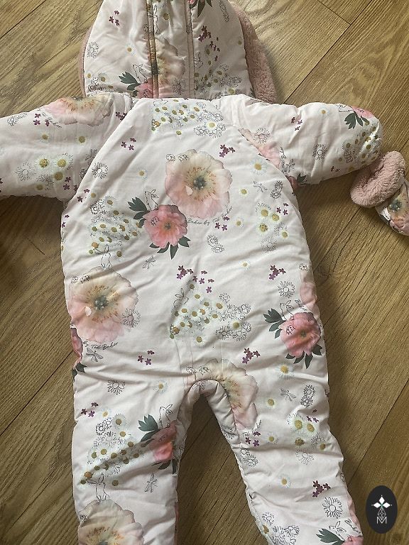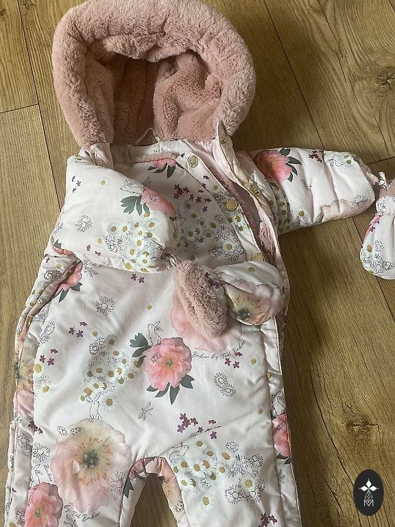 Labai šiltas ir gražus žiemos kombinezonas mergaitei. Pridėsiu ir kepurę (44 cm), kombinezonui pridedamos pirštinės.