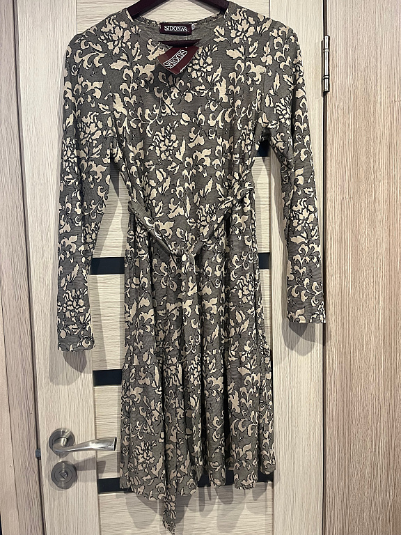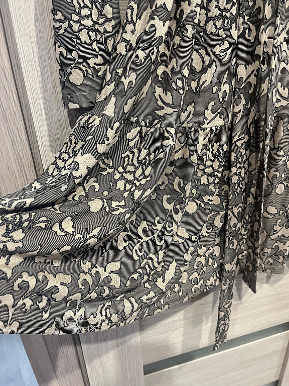 A very elegant and decorative shoulder strap design. The dress features a beautiful crane pattern. The fabric is silky, soft, but not silk, mix or polyester. Asos size 38. Suitable for S/M. This season, be beautiful with brown long boots, pants, or other brown accessories/jacket.
