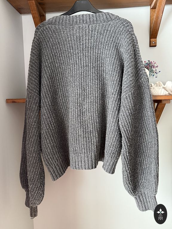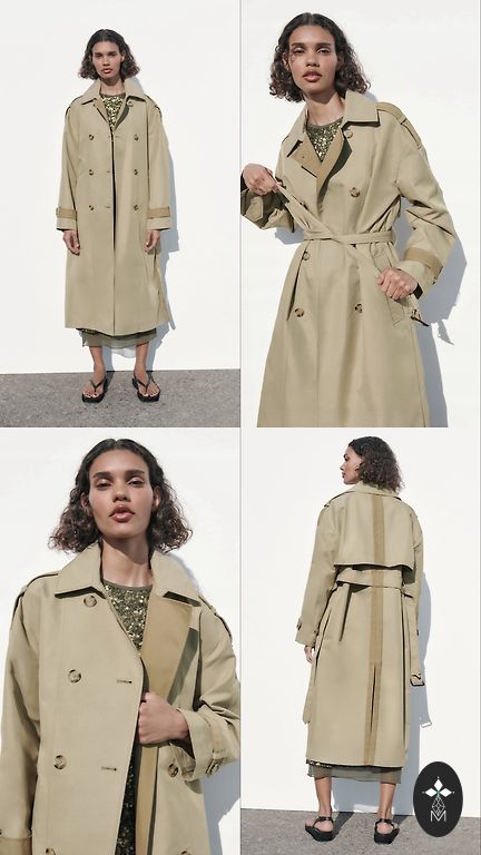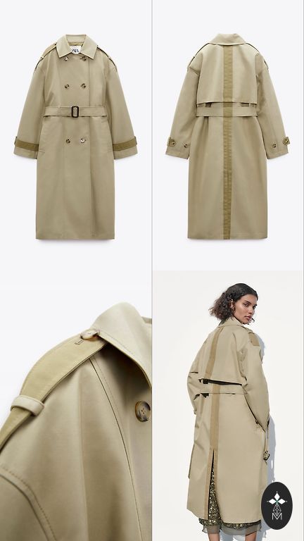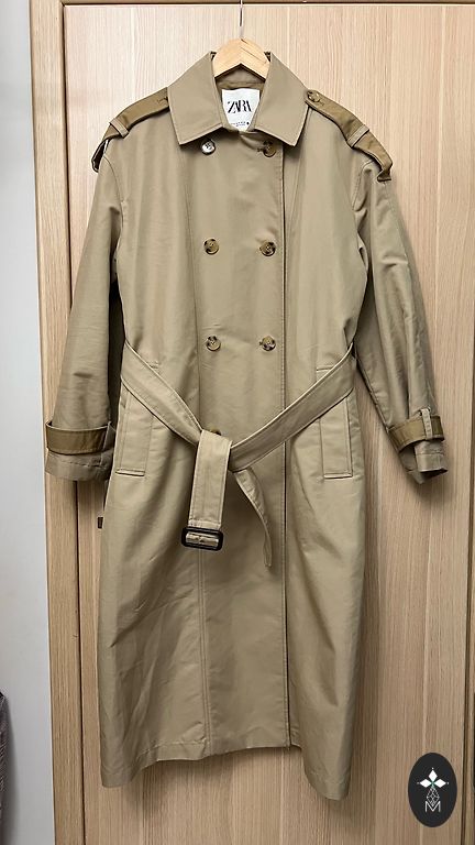 Visada madingas paltas su diržu, vidutinio ilgio, dviejų spalvų detalės, etiketėje M/L, yra gana didelio dydžio, bendras ilgis 120 cm, krūtinės plotis 60 cm, 100% poliesteris.