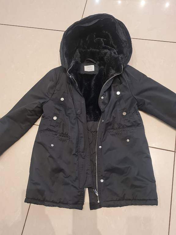Müün sooja talvejope, (UK 13-14), musta kapuutsiga, vähekasutatud, defektideta. Jope pikkus 72 cm, varruka pikkus 62 cm, õlgade laius 42 cm. Saatmine ei ole hinna sees.