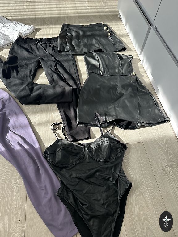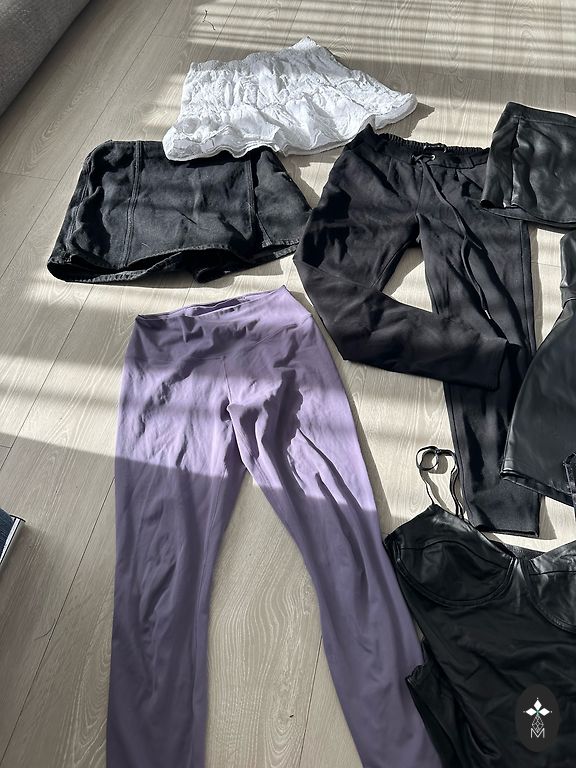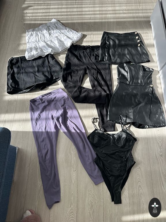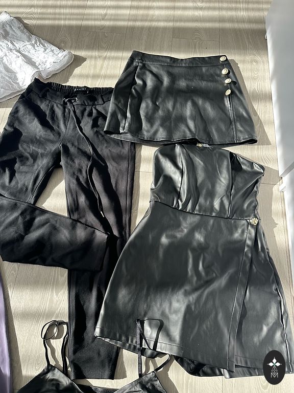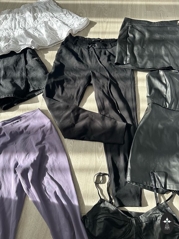 S dydžio kelnės su elastine juosmens dalimi, kišenėmis šonuose ir mažais įpjovimais galuose.