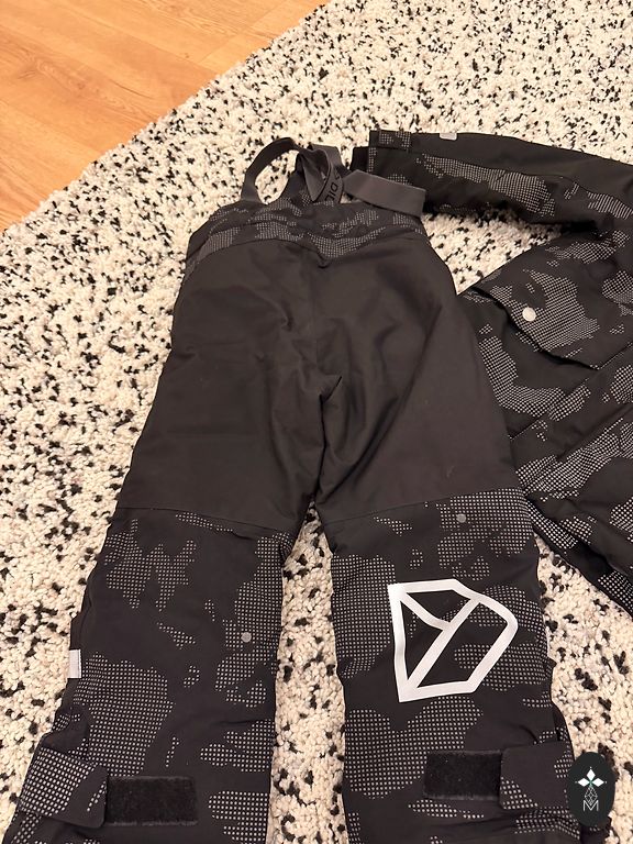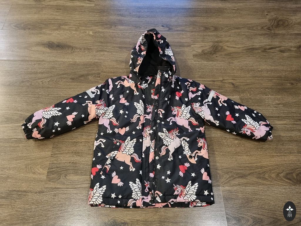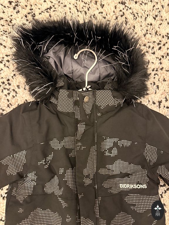 The jacket has 2 zippers, a warm hood, and multiple pockets.