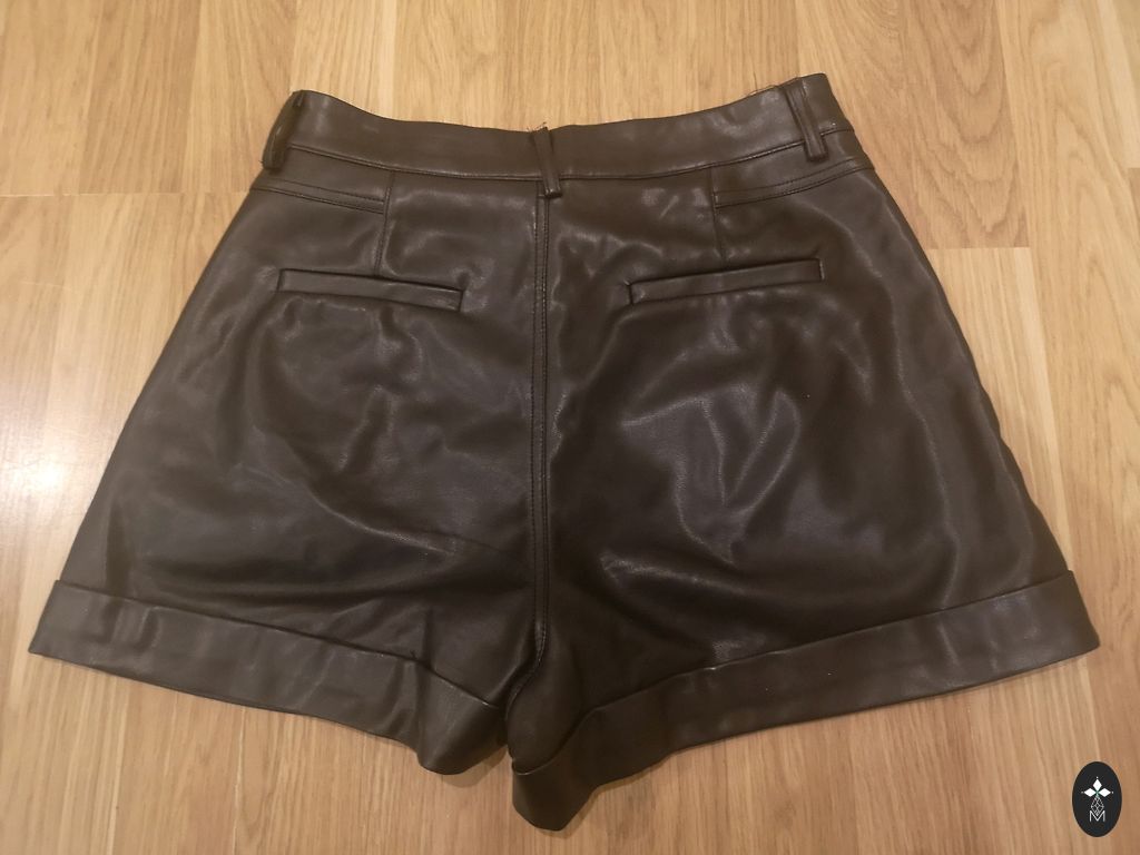 Lieliski šorti, mīksta, patīkama eko āda. Skaisti izskatās ar tīkliņzeķubiksēm un gariem zābakiem. Viduklis 76 cm, gurni 116 cm, šortu garums 51 cm, labi der M izmēram, ļoti ērti. Sānu kabatas funkcionējošas, aizmugurē ir kabatu imitācija.