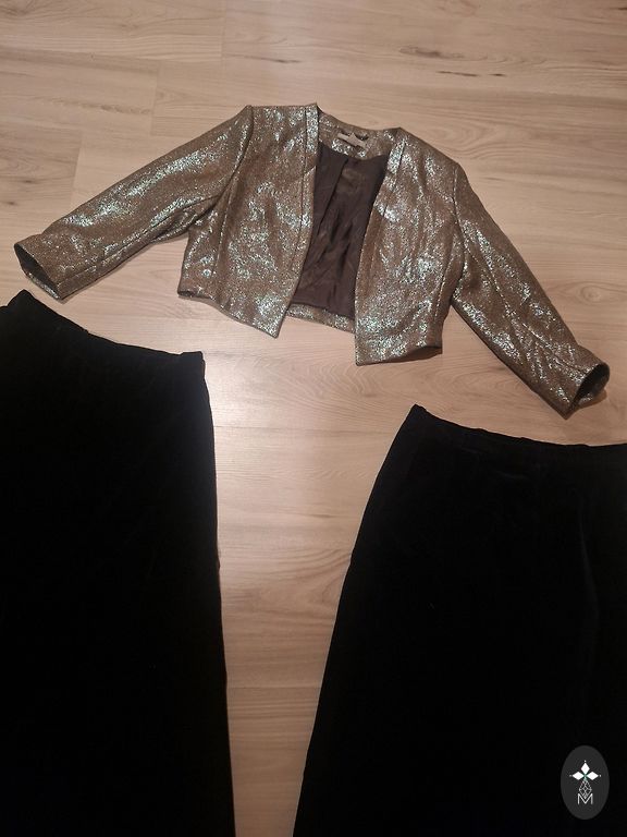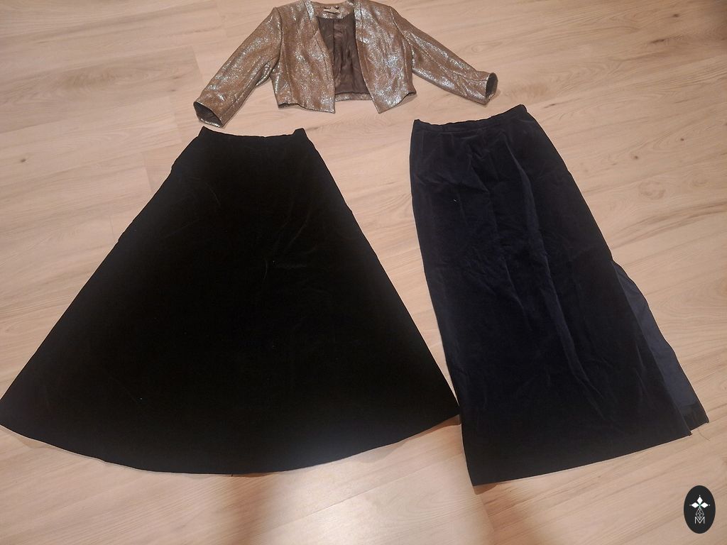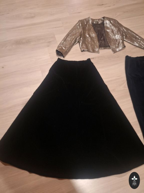 Kampsun-rinnaümbermõõt 55cm (ilma venitamiseta), pikkus 67cm, Püksid-kogupikkus 108cm, sisemõõt 76cm, talje kummiga ilma venitamiseta 40cm. Seelik "Topshop" L suurus, talje kummiga, pikkus 103cm.
