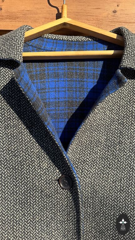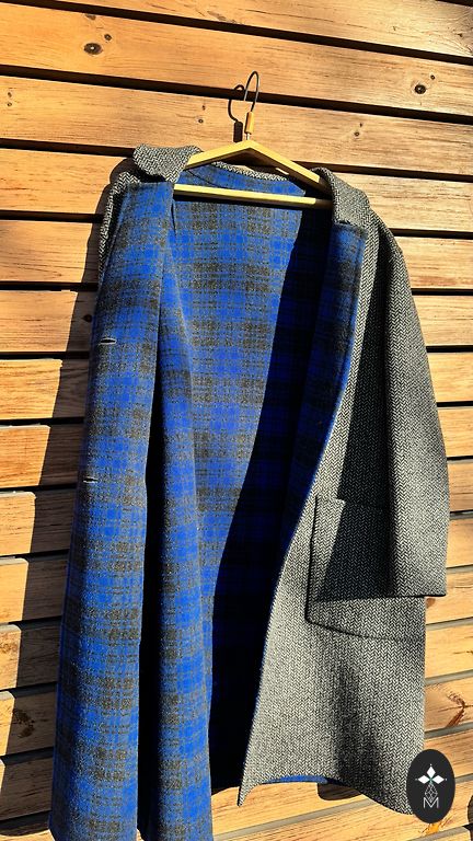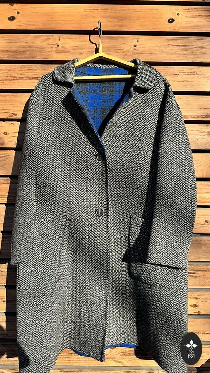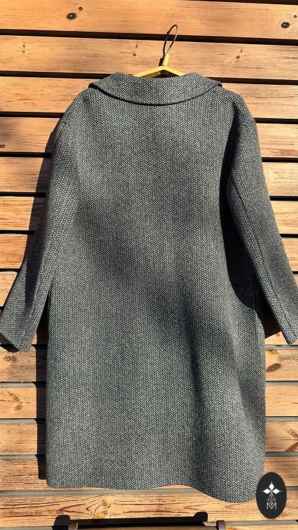 Elegantne, soe, mugav poolmantel. Müün ainult seetõttu, et endale kitsas. Must kunstkarakul, ruuduline ja hall mantlikangas, taskud, nahast viimistlus tõmblukkudele, kõrge krae. Õlad 45, rind 50, puusad 55, varrukas 63cm, pikkus 94cm.