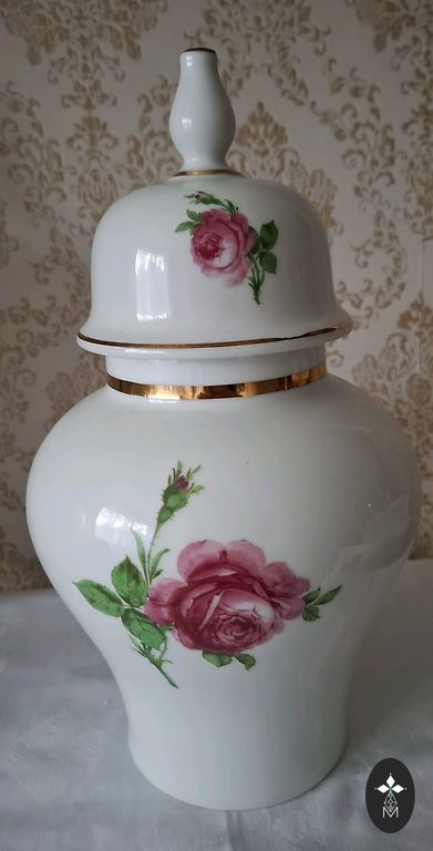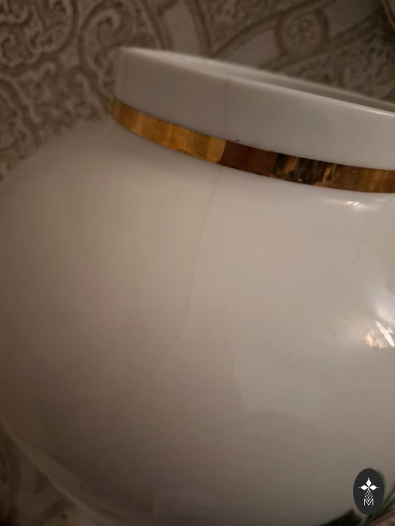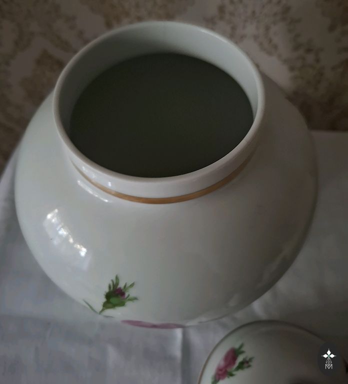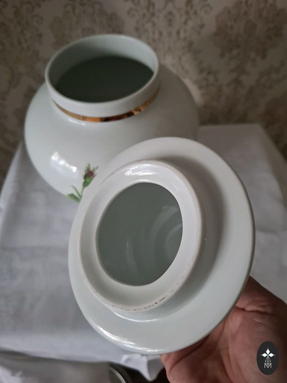 Dekoratīva stikla burka (lietota). Plaisājoša stikla imitācija. Būtisku trūkumu nav, taču roktura skrūvītes, kuras nav gandrīz redzamas, ir rūsējušas. Uzgriežņi dekoratīvie rokturim, kas redzami, labā stāvoklī. Aptuvenie izmēri - augstums 26 cm, diametrs 17 cm
