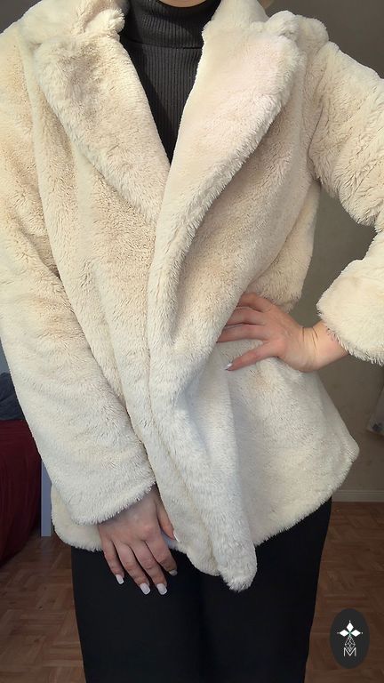Black relatively thin artificial fur coat, purchased from Pull&Bear. Pleasantly soft to the touch, not thick, worn little. Not intended for cold weather conditions. Will not fit a size larger than M, as it closes with hooks, joining both sides.