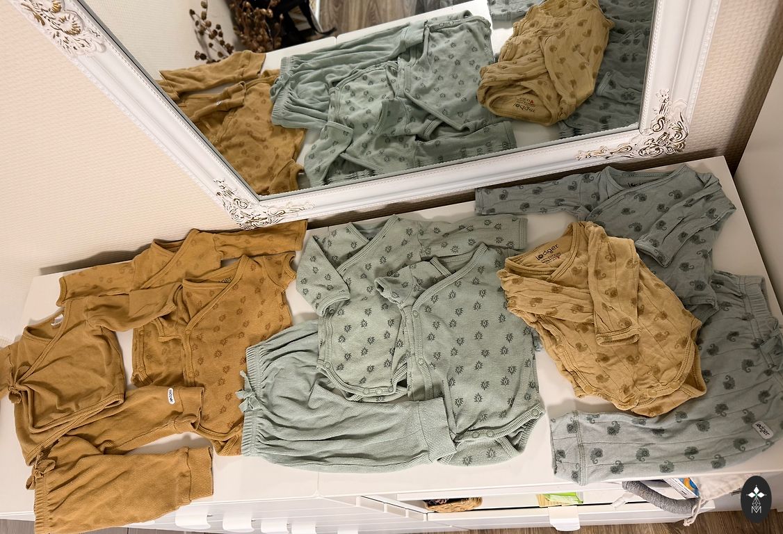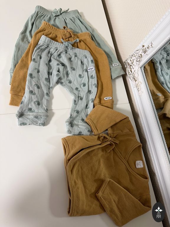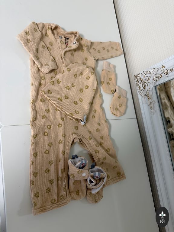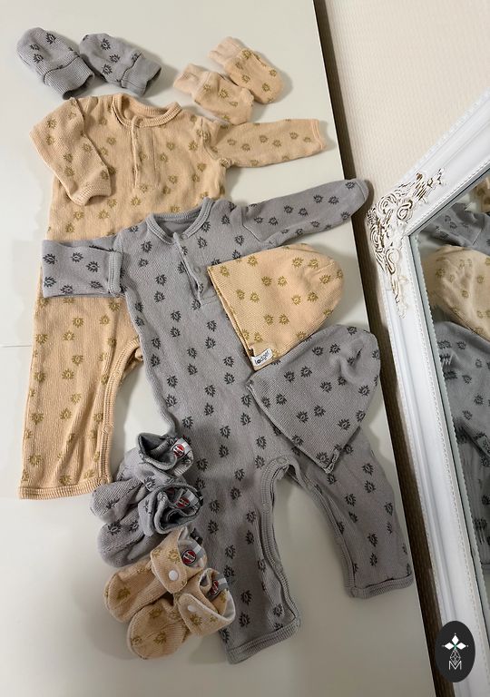 Smėlio spalvos komplektas su zuikučiais.