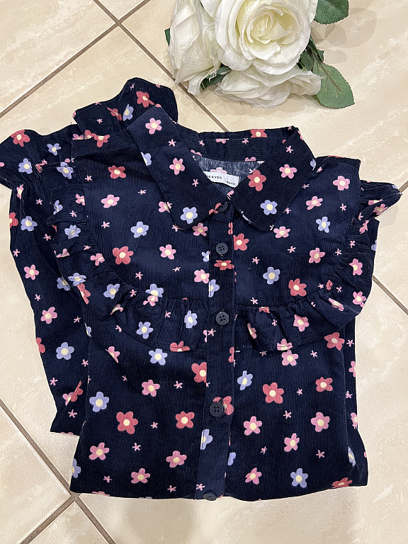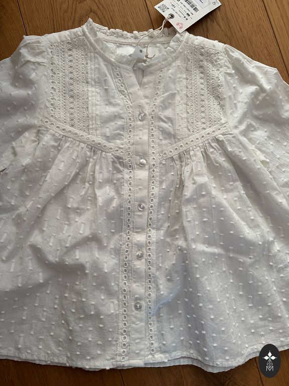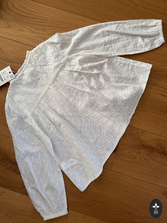 2 blouses, the white one with polka dots is new, cotton. The other is slightly used. Size 134. Will fit 128/134. Price for both - not separating.