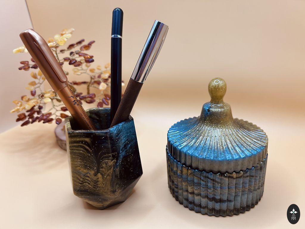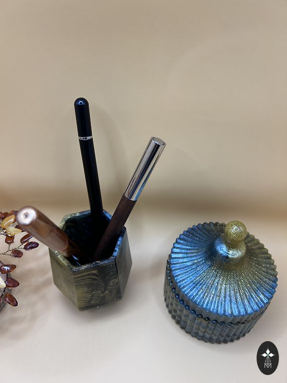 Ainulaadne ühekordne kingitus ehete, kirjutusvahendite ja pisiasjade hoidmiseks. Kuldne sära ja sügav sinakasroheline värv loovad peene kontrasti. Käsitöö neile, kes hindavad detaile ja värvide harmooniat.