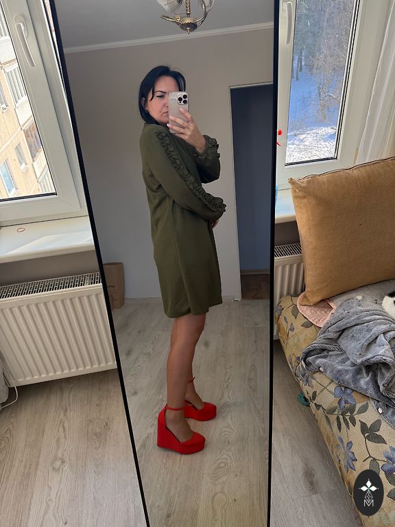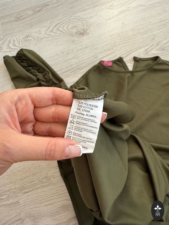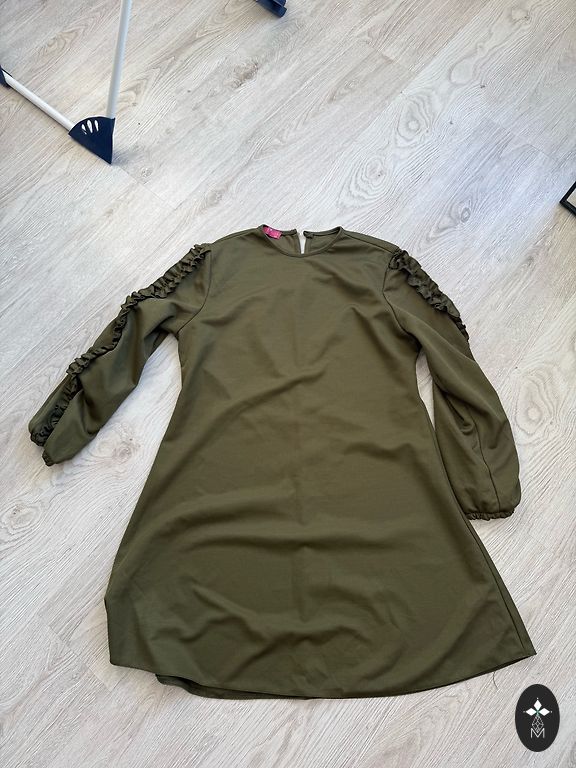 Tootja suurus - L40. Mugav, kortsuvastane materjalist kleit poolpikkade varrukatega, elastne. Kerge, mitte raske. Kleit ees külgedel seotav, tekitades voldid. Saab visuaalselt maskeerida, kui midagi on varjata ;) Koostise silt on ära lõigatud, kuid võib olla polüester koos viskoosi ja elastaaniga. Ei saa kinnitada, ei mäleta.