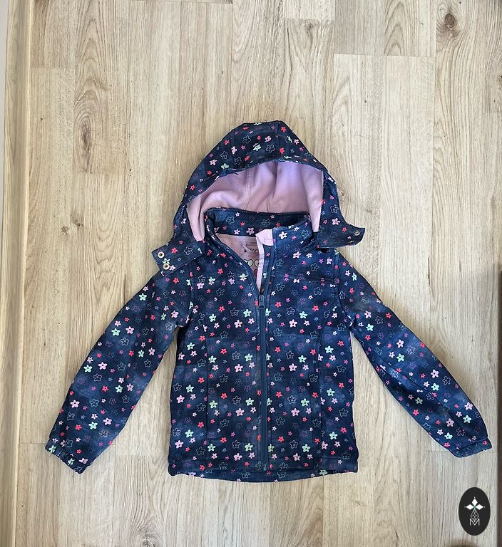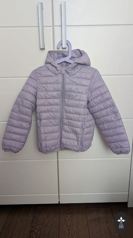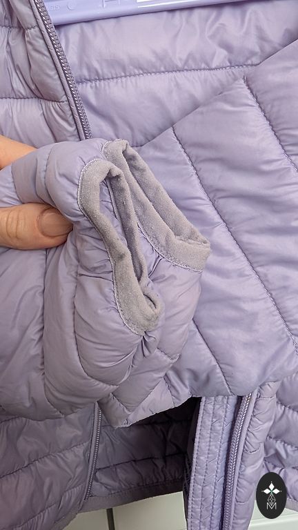 Winter/spring jacket is not thick, very nice, water and wind resistant, comes with a warm hat insulated with fleece North Bend, no gloves, without defects, I sent it, fitted from 104 to 116 cm, color more purple than blue.