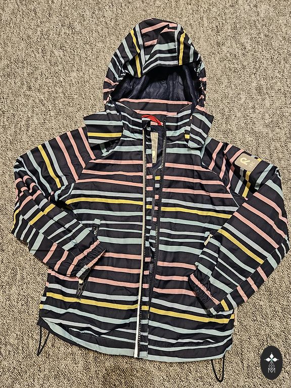 Mētelis atgrūž ūdeni un ir elpojošs. Vēja necaurlaidīgais materiāls pasargā no aukstiem vējiem. Priekšpusē ir kabata ar spiedpogu, un mētelim ir noņemama kapuce un atstarotājs, kas nodrošina papildu drošību tumsā.