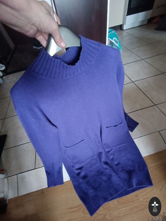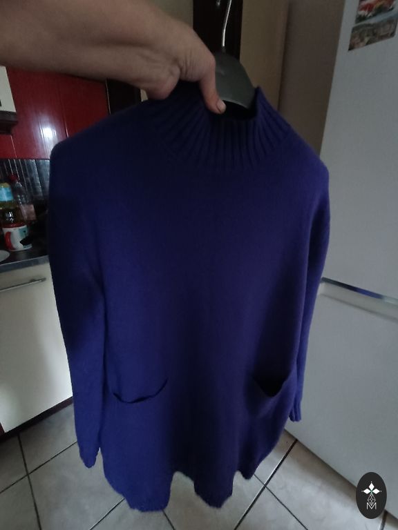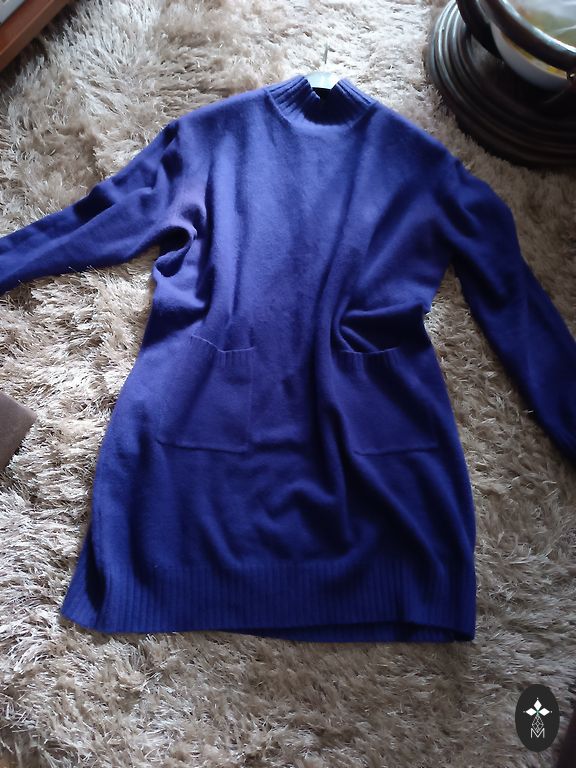 Mõõdud: varruka pikkus kaelast 82 cm, kampsuni pikkus 62 cm, maksimaalne laius 112 cm. Tundub kerge, pehme. Koostises 12% vill.